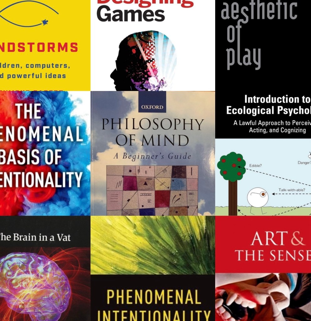 The following growing list of works have helped me develop my own perspective on the subject of interactive media as art grounded in an understanding of experience, the mind, aesthetics, and play. Some have built my understanding of phenomenology, philosophy of art, and embodied cognition, while others have offered a juxtaposition off which I could bounce my evolving view. All are suggested reading for anyone interested in approaching games and interactive media as an expressive, sui generis art form.